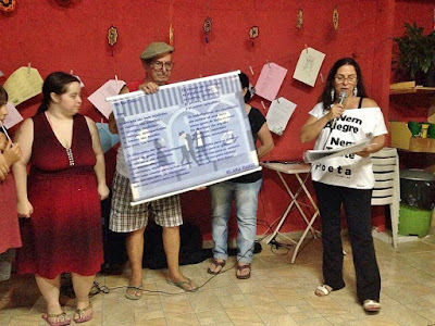 Lançamos o VARAL DE TROCAS POÉTICAS e nele penduramos poemas e textos, para que cada pessoa deixasse o seu e levasse um a sua escolha (não funcionou bem, pois os poetas costumam ser distraídos ou esquecidos... a maioria não levou nada para trocar, de modo que os textos acabaram sendo distribuídos ao final da noite).